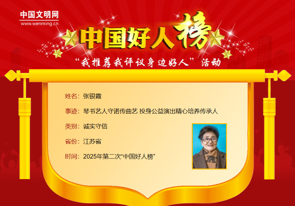 张银霞,女,1948年6月生,江苏省苏北琴书省级代表性传承人。张银霞答应父亲要求并郑重许下传承苏北琴书的诺言,这一诺,便是六十余年的坚守。她始终践行“艺术服务于民”的初心,先后参与惠民演出2000多场,惠及观众30万多人次。从青葱岁月到白发染霜,张银霞始终坚守着对苏北琴书的传承使命。张银霞曾荣获“中国曲艺牡丹奖”等荣誉。