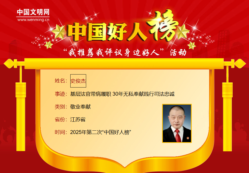 史俊杰,男,1970年生,中共党员,生前系江苏省南京市江宁区人民法院房地产庭法官。史俊杰身患强直性脊柱炎20多年,在以顽强毅力与病魔斗争的同时,始终坚守在一线审判岗位,办结多起全国“首例”案件,用法槌坚定维护公平正义。他心系群众,始终把百姓疾苦放在心头,面对涉民生案件,想方设法确保群众权益落到实处,赢得了当地群众的肯定和赞许。