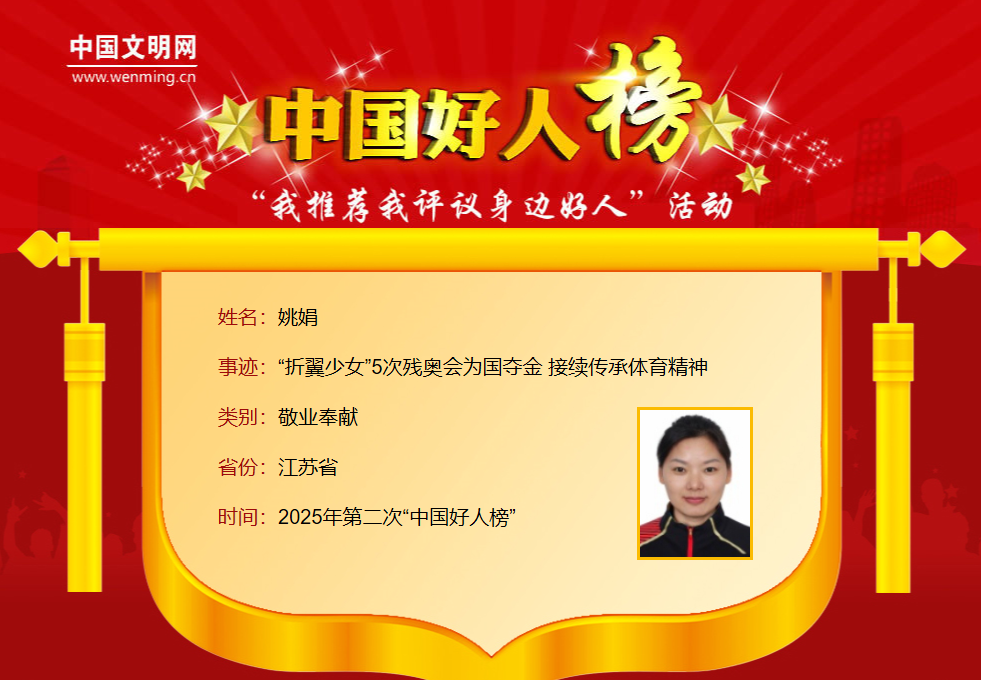 姚娟,女,1984年7月生,江苏省无锡市残疾人综合服务中心科员,江苏省残疾人田径队教练员兼运动员。姚娟共获得五次残奥会冠军,保持着投掷类运动(铅球、铁饼、标枪)的多项世界纪录,且是世界罕有的残奥会投掷类运动“大满贯”运动员。姚娟曾荣获全国五一劳动奖章、全国三八红旗手、全国优秀运动员等荣誉。