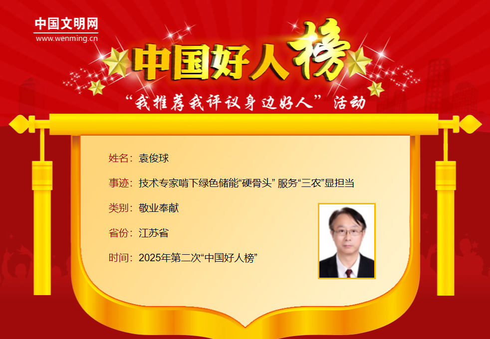 袁俊球,男,1971年5月生,中共党员,江苏省常州某电力有限公司三级专家。袁俊球扎根能源领域30余载,取得授权专利30余项,攻克蒸汽储能、粮食烘干、智慧渔业等多项技术难题,累计为企业降本超1.5亿元,惠及金坛区300余家企业和乡村产业项目。他深知农民生活艰辛,主动利用休息时间跑遍田间地头为农民解决生产技术难题。袁俊球曾荣获全国劳动模范、全国五一劳动奖章等荣誉。