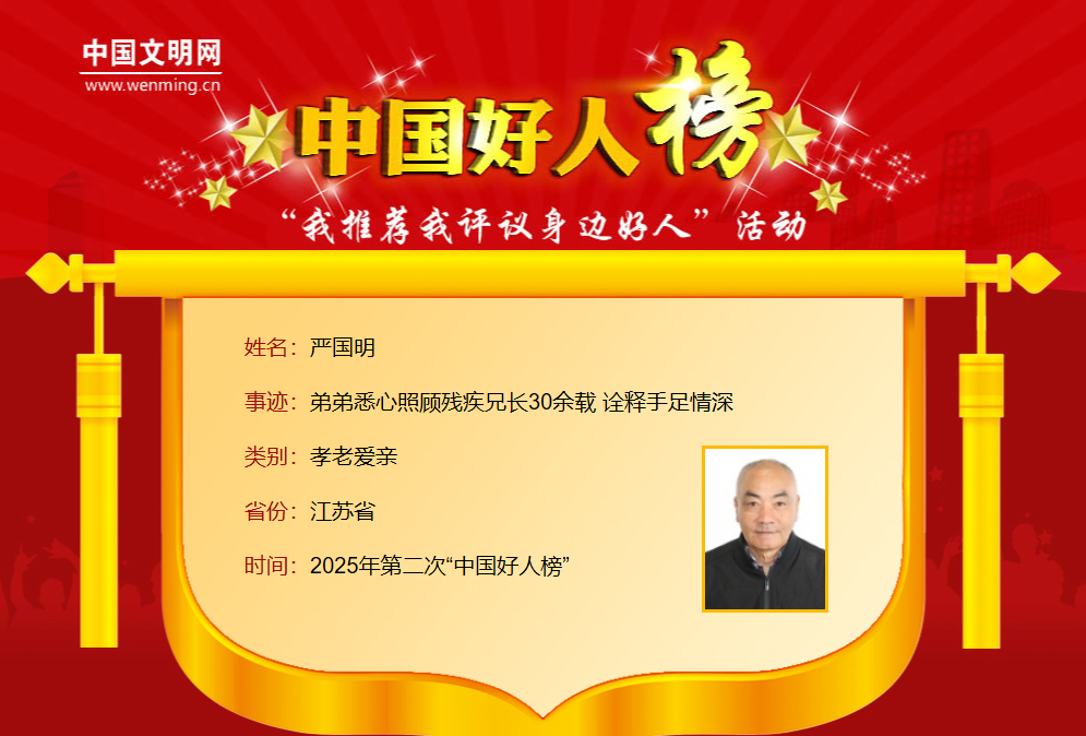 严国明,男,1956年7月生,江苏省太仓市浮桥镇新邵村村民。1988年严国明承担起照顾兄长的重任,他和妻子一边打工养家,一边悉心照料哥哥。30余年的光阴里,他未曾踏足远方,却用双脚丈量出亲情的厚度、诠释了手足情深。