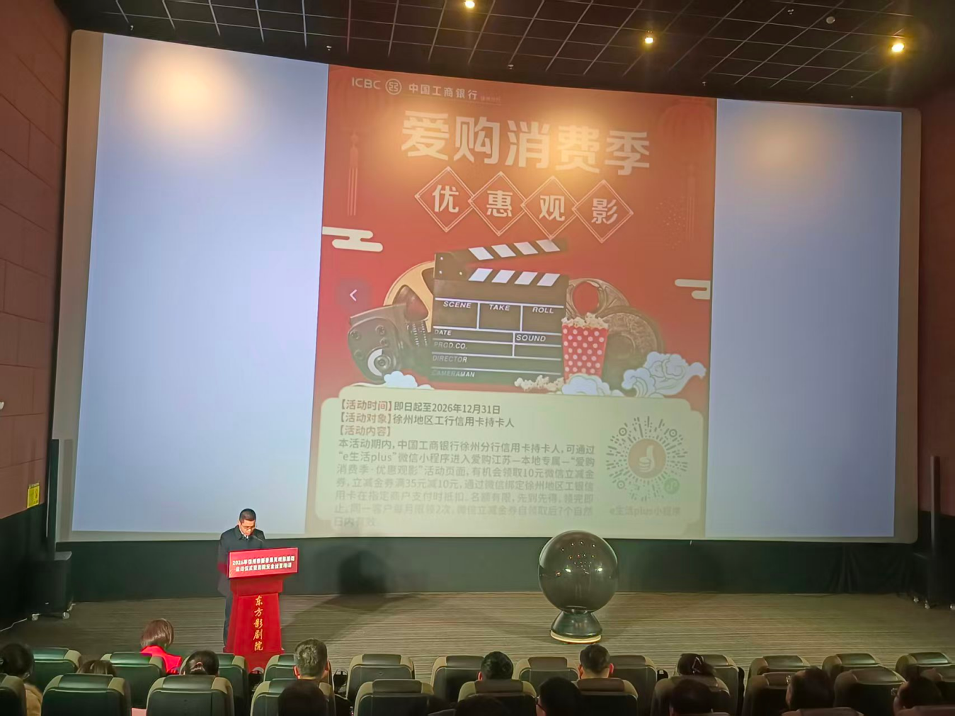 启动仪式上,徐州市电影协会推介了2026年春节档重点影片。市总工会发布了2026年“工会请你看电影”活动内容,中国工商银行徐州分行同期推出“爱购消费季——优惠观影”活动,共同为市民观影提供多样化优惠。