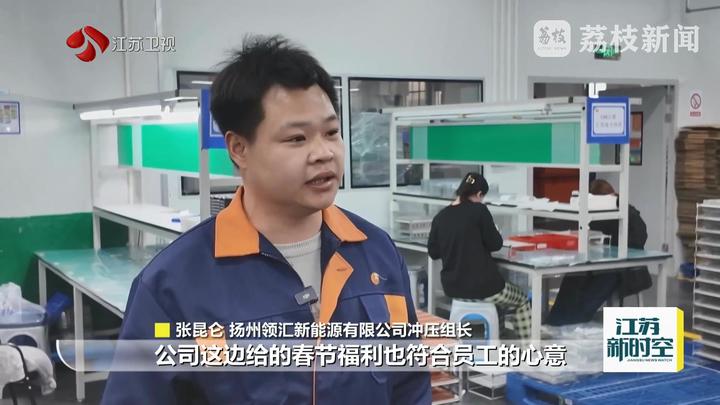 扬州领汇新能源有限公司冲压组长张昆仑说:“公司这边给的春节福利也符合员工的心意。公司发展越来越好,我们的收入也是一级一级往上增加,我们也有奔头。”