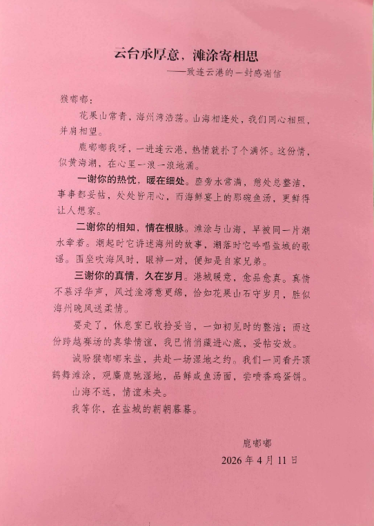 盐城队还为连云港队留下一封真挚的信。文字不长,情谊厚重。文明观赛、友好互动,既为赛场添彩,更是对体育精神最好的致敬。