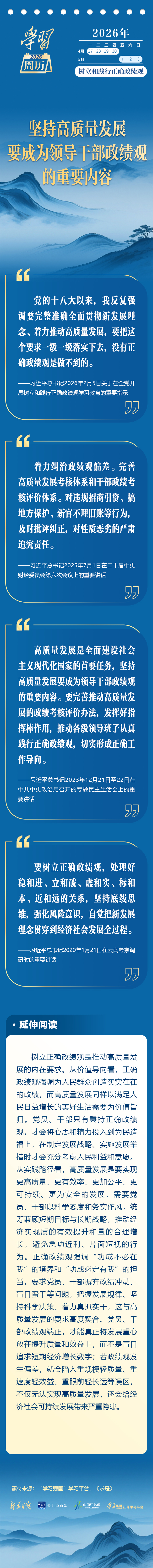 4月1日出版的第7期《求是》杂志发表中共中央总书记、国家主席、中央军委主席习近平的重要文章《树立和践行正确政绩观》。这是习近平总书记2012年12月至2026年2月期间有关重要论述的节录,深刻阐明了关于树立和践行正确政绩观的一系列重要理论和实践问题,为广大党员、干部以正确政绩观履职尽责、干事创业提供了根本遵循。本期《学习周历》,将带大家深入学习领悟“坚持高质量发展要成为领导干部政绩观的重要内容”。