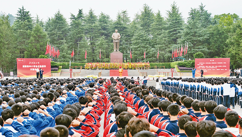 近年来,湖南以韶山为试点,打造“我的韶山行”红色研学品牌,创新思政教育模式,引导学生传承红色基因、坚定理想信念。图为2025年10月16日,“我的韶山行”红色研学开班仪式在韶山市毛泽东广场举行。(韶山思政教育实践中心供图)