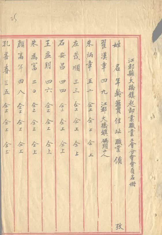 1947年的一份《江都县大桥镇起卸职业工会分会名册》,记载了当年“起卸职业”会员的部分人员信息。所谓“起卸职业工会”其实就是码头工人工会,会员都是码头工人。档案记载的内容主要是工会会员的姓名、年龄、籍贯、住址等。可以看到,名册上的这批码头工人都是大桥镇本地人,年龄集中在30岁—40岁之间,年龄最小的只有20岁,50岁以上的仅1人,为52岁。