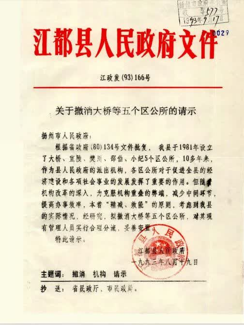 这是1993年8月19日江都县人民政府抄送给市政府及省民政厅等机构的一份文件,其中写道:“我县于1981年设立了大桥、宜陵、樊川、邵伯、小纪5个区公所,10多年来,作为县人民政府的派出机构,各区公所对于促进全县的经济建设和各项社会事业的发展发挥了重要的作用。但随着机构改革的深入,为克服机构重叠的弊端,减少中间环节,提高办事效率,本着‘精简、效能’的原则,考虑到我县的实际情况,经研究,拟撤销大桥等五个区公所。”