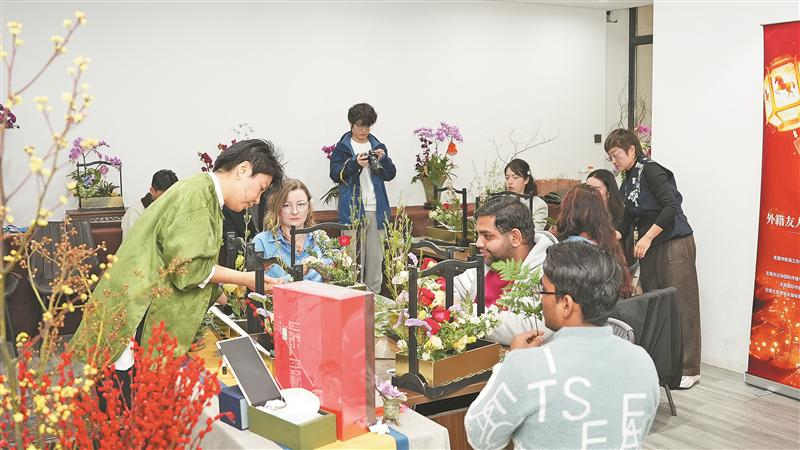 随后,吴韵插花非遗代表性传承人贾玎带领外籍友人开启了吴韵插花非遗体验环节。吴韵插花作为无锡市级非物质文化遗产,是极具地域特色和深厚传统文化承载的艺术表现形式。来自孟加拉国的自媒体创作者Kader Marzana在贾玎的指导下,将玫瑰、勿忘我、小手球等各色花朵错落有致地插入花器中。“这是我第一次体验插花。我了解到不同的花在中国文化中有着不同的寓意。这次体验真的很棒!”她一边创作一边用手机记录,准备将这段体验分享给粉丝们。