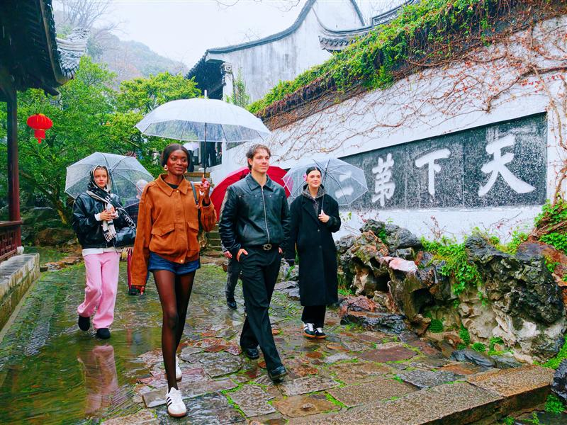 雨落江南,万物成诗。24日,寄畅园的回廊内,身着潮流服饰的国际超模款款而至,一步入江南,步步生春风。七星桥上,模特们撑着透明伞,缓步走过。清澈的伞面不遮园林风骨,反倒将模特们的身姿轮廓与黛瓦飞檐、桥影碧波尽数相融。先月榭内,水汽氤氲,模特们围坐品茗,茶香萦绕间,东方雅韵与世界风尚静静相拥,宛若一幅意境悠远的当代园林时尚画卷。模特们行至天下第二泉,泉石清幽,雨雾袅袅,伞下身姿亭亭,一步一履皆是东方雅韵与国际美学的诗意邂逅。“烟雨江南,太有诗意了。”纽约时装周亚太执行主席沈苹直言,惠山古镇有着截然不同的气质,而江南园林就是最具东方意韵的秀场,若能在此举办一场秀,能让中西方文化实现更好的融合与共鸣。