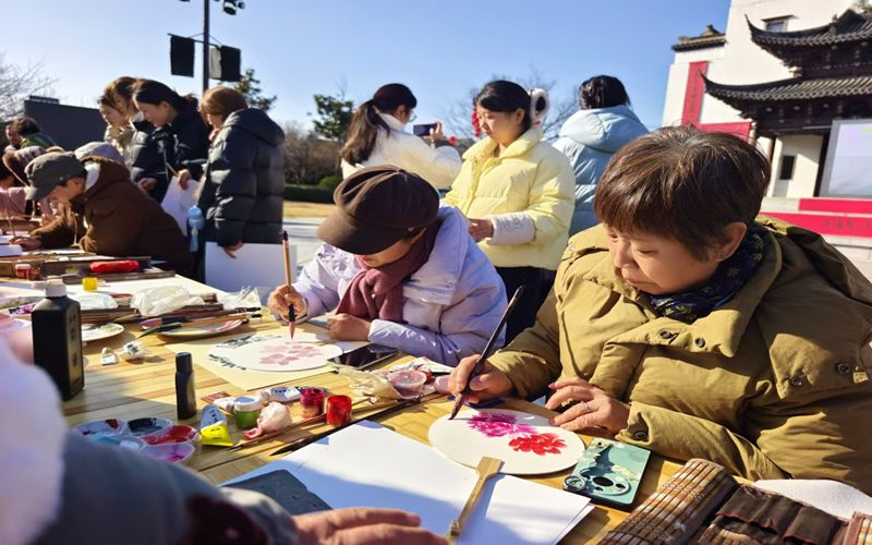 几位非遗老师凝神静气,手执毛笔,在洁白的扇面上挥洒自如。随着笔尖的流转,一朵朵雍容华贵的牡丹缓缓绽放,一只只灵动活泼的杜鹃鸟跃然纸上。精湛的技艺吸引了众多游客驻足观赏,不时发出阵阵赞叹。一位来自南京的游客捧着刚画好的扇子爱不释手:“太精美了!没想到在蒋坝能遇到这么高水平的艺术家,这把扇子是我此行最珍贵的‘蒋坝记忆’。”素白的扇子在艺术家手中变成了独一无二的艺术品,也成为文化惠民、艺术共享的生动载体。