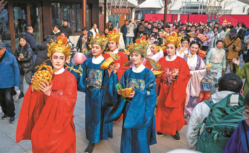 伴随着欢快的节拍,各路“财神”身着华服,手捧元宝、寿桃,在宝善街上演一出舞蹈快闪,吸引游客纷纷驻足、拍摄……昨日,惠山古镇景区“福喜中国年”活动发布(上图)。春节期间,景区将以“福禄寿喜财 福从惠山来”为主题,打造“福、禄、寿、喜、财”五大福运体验互动场域,并通过“集体展演+分点沉浸”的立体演艺,为游客带来“一步一景承吉兆,一景一福入心怀”的年味之旅。