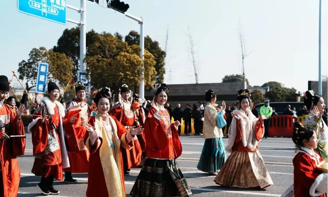 首支登场的“龙马精神领跑队”瞬间点燃全场:五福星与汉服队衣袂飘飘,尧帝尧母穿越千年而来,将尧乡文脉与新春祈愿融为一体。汉服方阵中,襦裙温婉、袄裙端庄、甲胄英气,仿佛一部行走的《国风大典》,引得众人驻足凝望。
