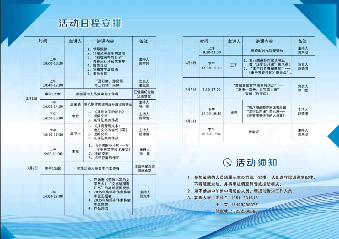 据主办方介绍,首届高邮文学周期间,将为广大文学爱好者精心呈上“十二道文学大餐”,以“123123”的数字密码,串联起一场文学盛宴:1场启幕仪式、2次信息发布、3场专业讲座、1次作家年会、2场汪学公开课、3次采风活动。