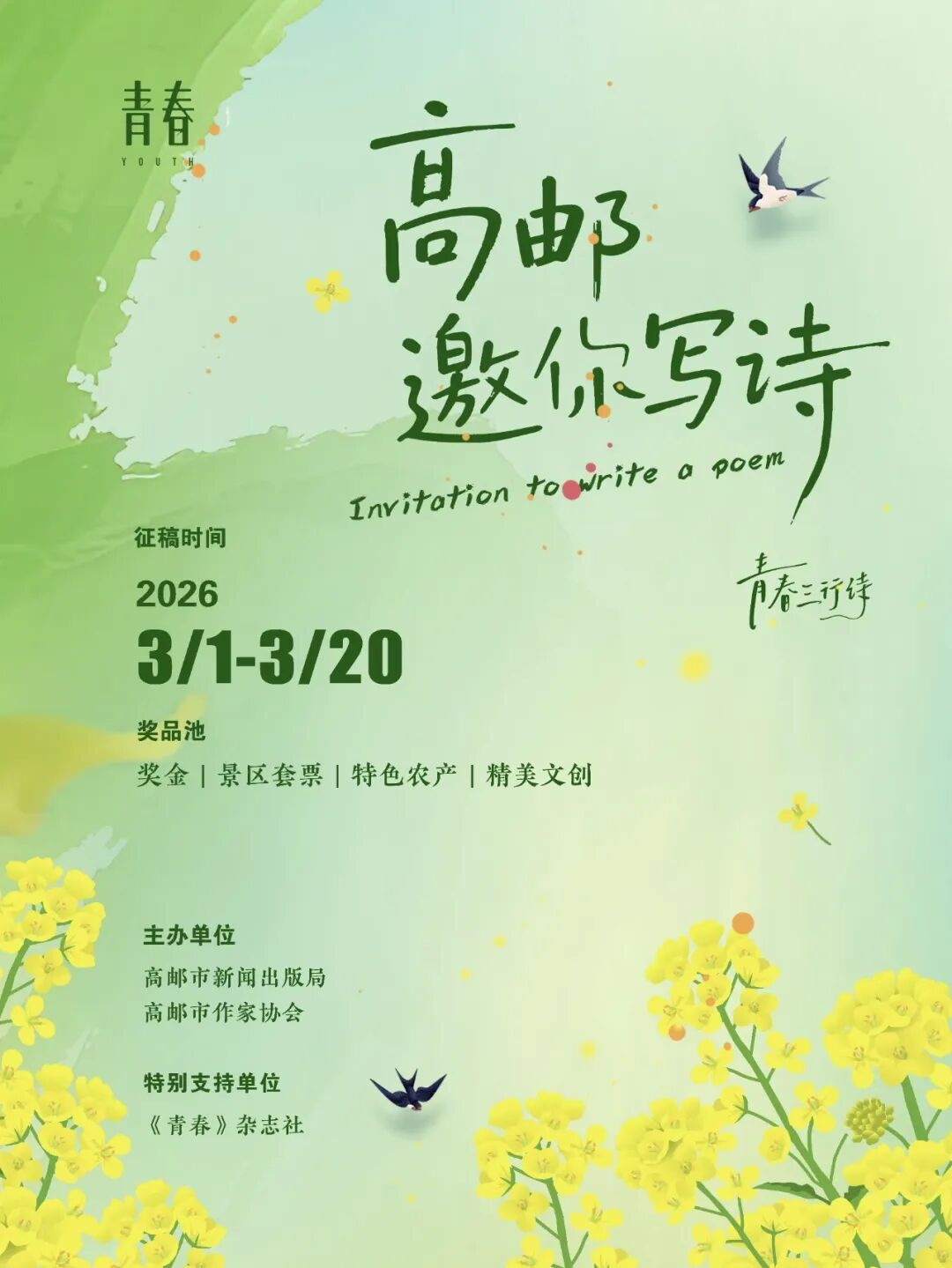 发布环节中,《青春》杂志主编李樯带来一枚充满诗意的“彩蛋”——正式发布“高邮青春三行诗”征稿活动。“别只在诗里看高邮,来这里,把青春过成诗吧。”李樯说,高邮是一座文脉悠长的文学之乡,无数文学爱好者在这里默默耕耘。“我特别期待通过这样的活动,让更多市民爱上阅读,真正提高对这片土地的认知,更重要的是,在文字中滋养内心。这份丰盈,对我们生活的帮助,是无可替代的。”