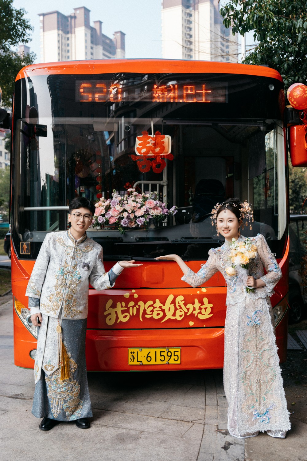 为让新人的迎亲之路安全顺畅、仪式感拉满,婚礼前夜,丹阳公交工作人员早已忙碌起来,对这辆肩负特殊使命的公交车开展彻底清洁与细致性能检测,从车辆制动到空调运行,每一个细节都反复核查、一丝不苟,用专业与用心,全力守护新人的幸福出行。婚礼当天,这辆装饰着大红喜字、彩色气球的“幸福专车”准时出发,新郎郝英才在亲友团的见证下,迎接新娘钱璀登上车厢。车身,“我们结婚啦”的甜蜜标语随处可见,鲜红的“囍”字在阳光下熠熠生辉;窗外,行人纷纷驻足,投来祝福的目光与微笑,整座城市都见证着这份甜蜜。