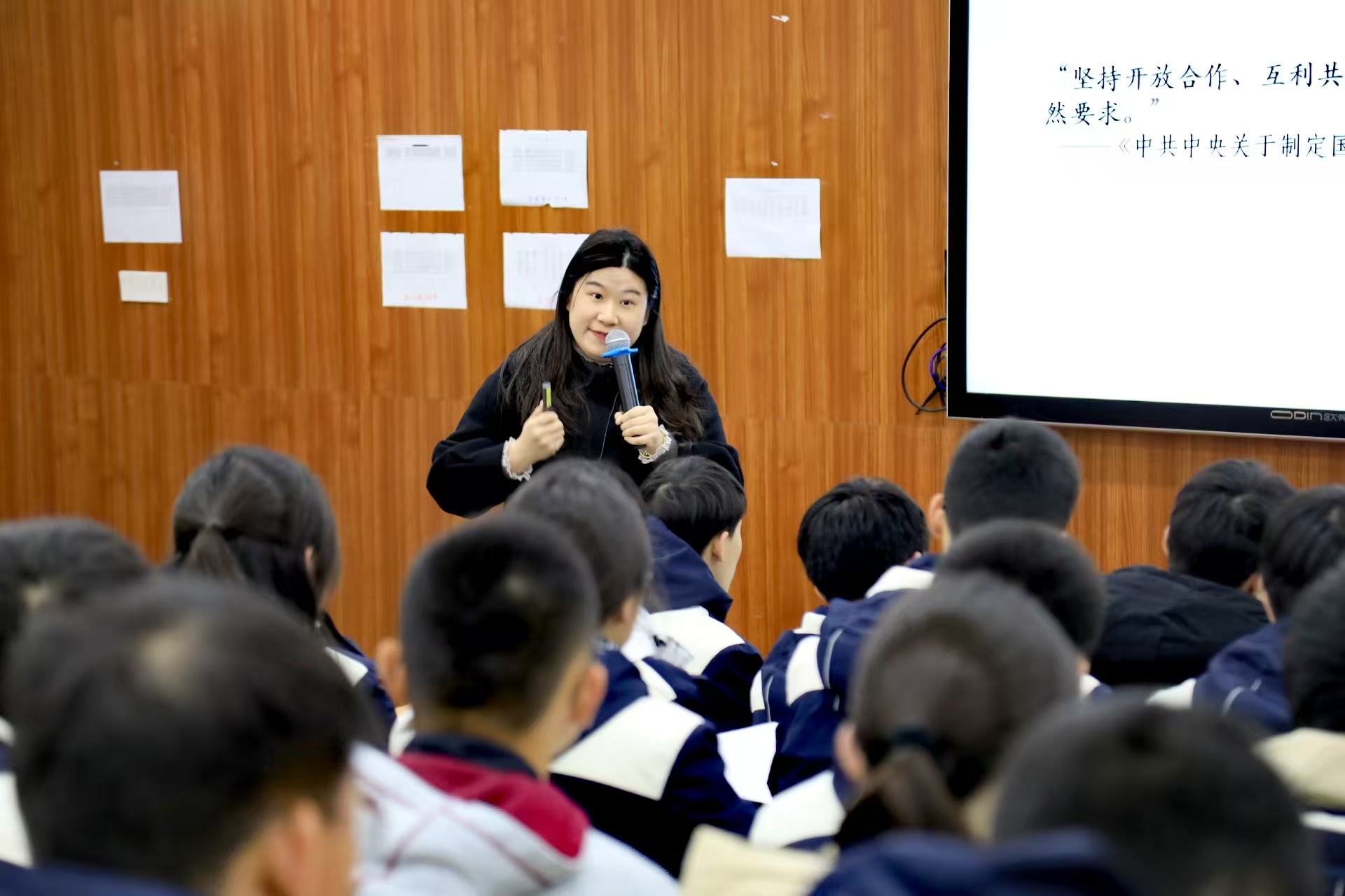 高中学段,南京市第一中学沈晨老师以“理解高质量发展的时代要求与青年责任”为主题,执教了题为《提高更高水平对外开放,推动高质量发展》的现场课。沈老师引导学生运用比较、辨析等方法,在历史与现实的维度中,深入理解高水平对外开放的战略意义与时代内涵。
