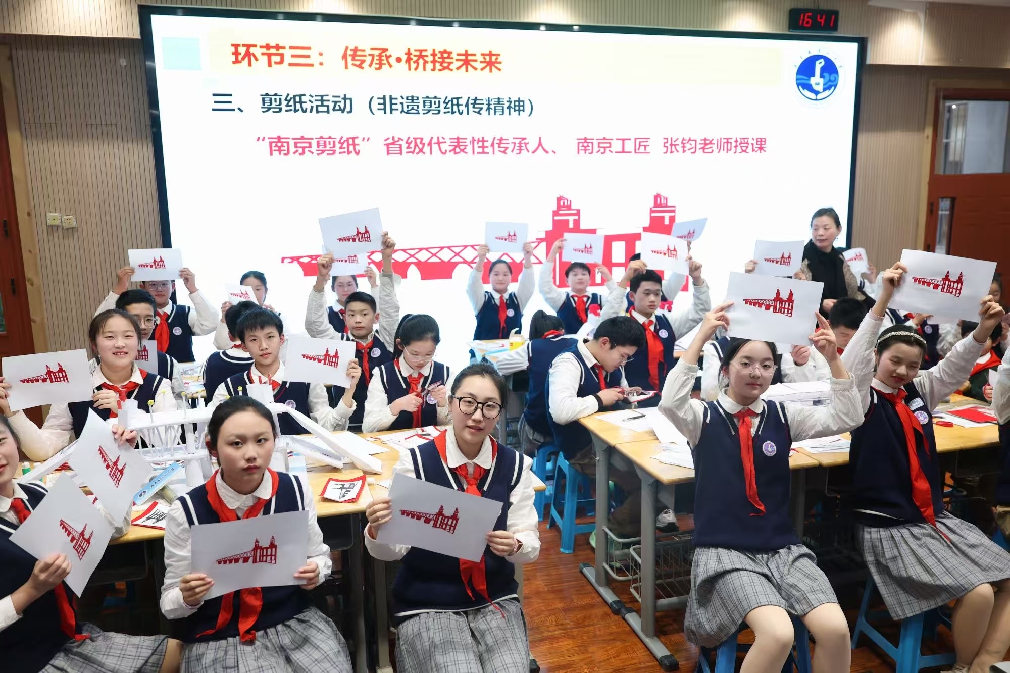 南京市滨江中学道德与法治学科组组长杨敏老师带来别开生面的《南京长江大桥的时代回响》思政融合课展示,在思政课程中有机融合了地理、物理、美术等学科知识,让学生在知识碰撞中重温大桥建设的峥嵘岁月,在潜移默化中汲取科学家精神的磅礴力量。著名非遗剪纸传承人张钧现场指导学生创作《南京长江大桥》主题剪纸,以别具匠心的剪纸艺术再现长江大桥风貌,让思政教育在沉浸式体验中入脑入心。