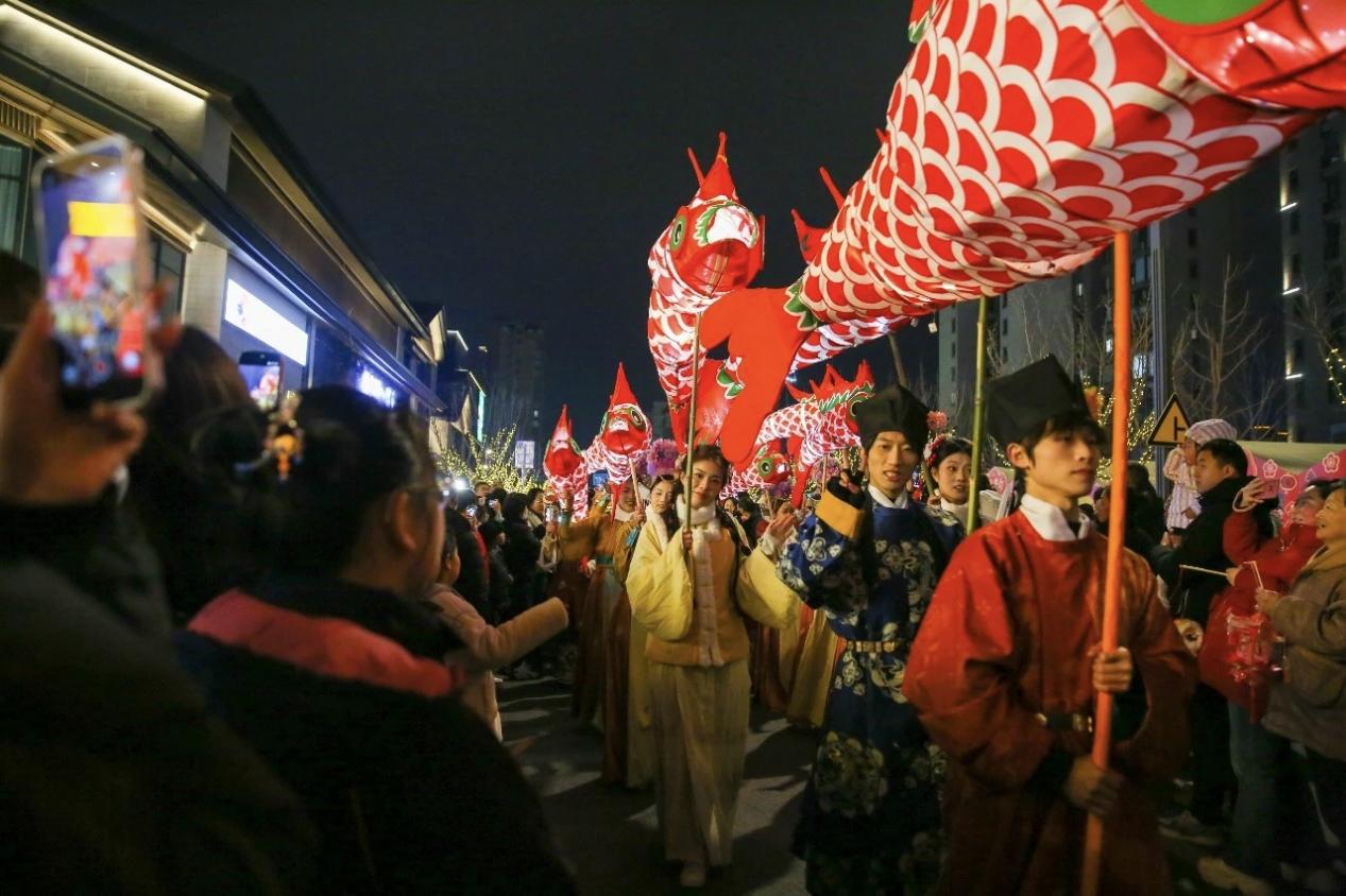 农历正月十五,磨头镇龙游河畔人潮涌动。数千名群众观看鱼灯沿河巡游,舞龙舞狮队穿梭人群,踩高跷艺人引得阵阵欢呼,这场“马上磨头·好事多多”主题活动,让传统民俗焕发新活力。拾锦里“繁花锦里”游园会上,非遗巡游、国潮游乐吸引市民纷纷打卡;长江镇元宵非遗市集热闹开市;博物馆、图书馆里猜灯谜活动吸引了不少群众前来体验,市民在浓浓的文化氛围中欢度佳节。