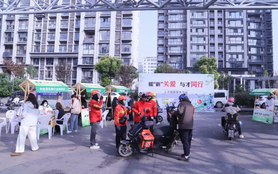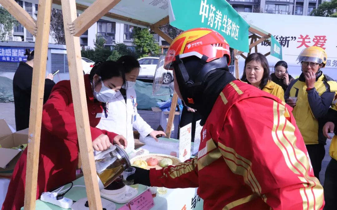 中药养生茶饮区飘来阵阵清香,专业配方的热茶饮暖胃又养生;健康礼品发放区热闹非凡,艾灸贴、膏药、充电宝、口罩等跑单必备品被一抢而空,京东骑手杨春捧着礼包感慨:“全是刚需,太贴心了!”
