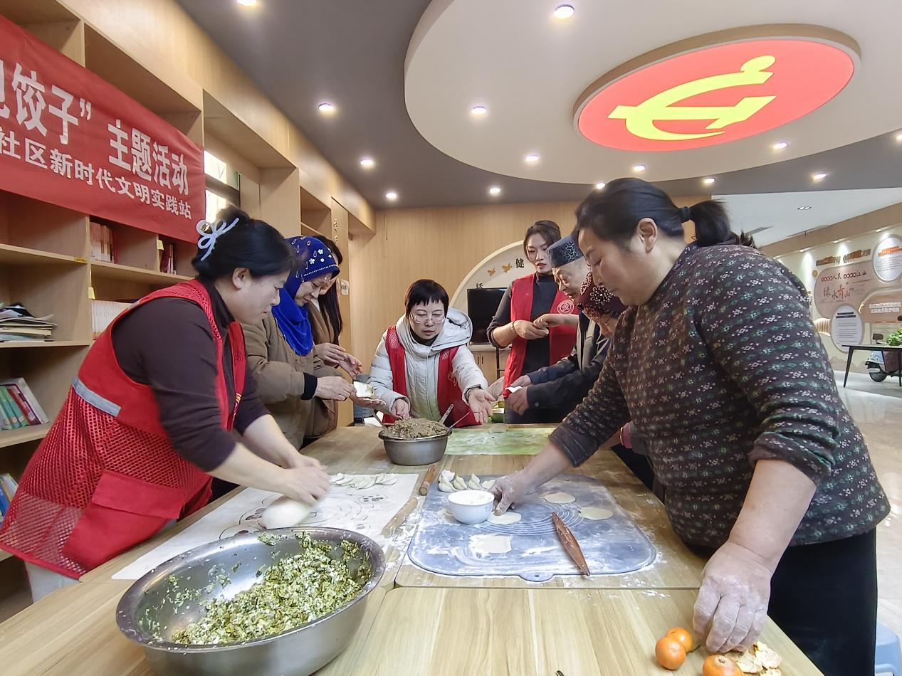 左庄社区新时代文明实践站则以“民族团结一家亲,温暖冬至包饺子”为主题开展活动,特别邀请辖区少数民族居民共同参与。各族居民分工协作、默契配合,在共同动手制作美食的过程中,深入交流、增进了解,像石榴籽一样紧密团结在一起,充分展现了民族团结一家亲的深厚情谊。