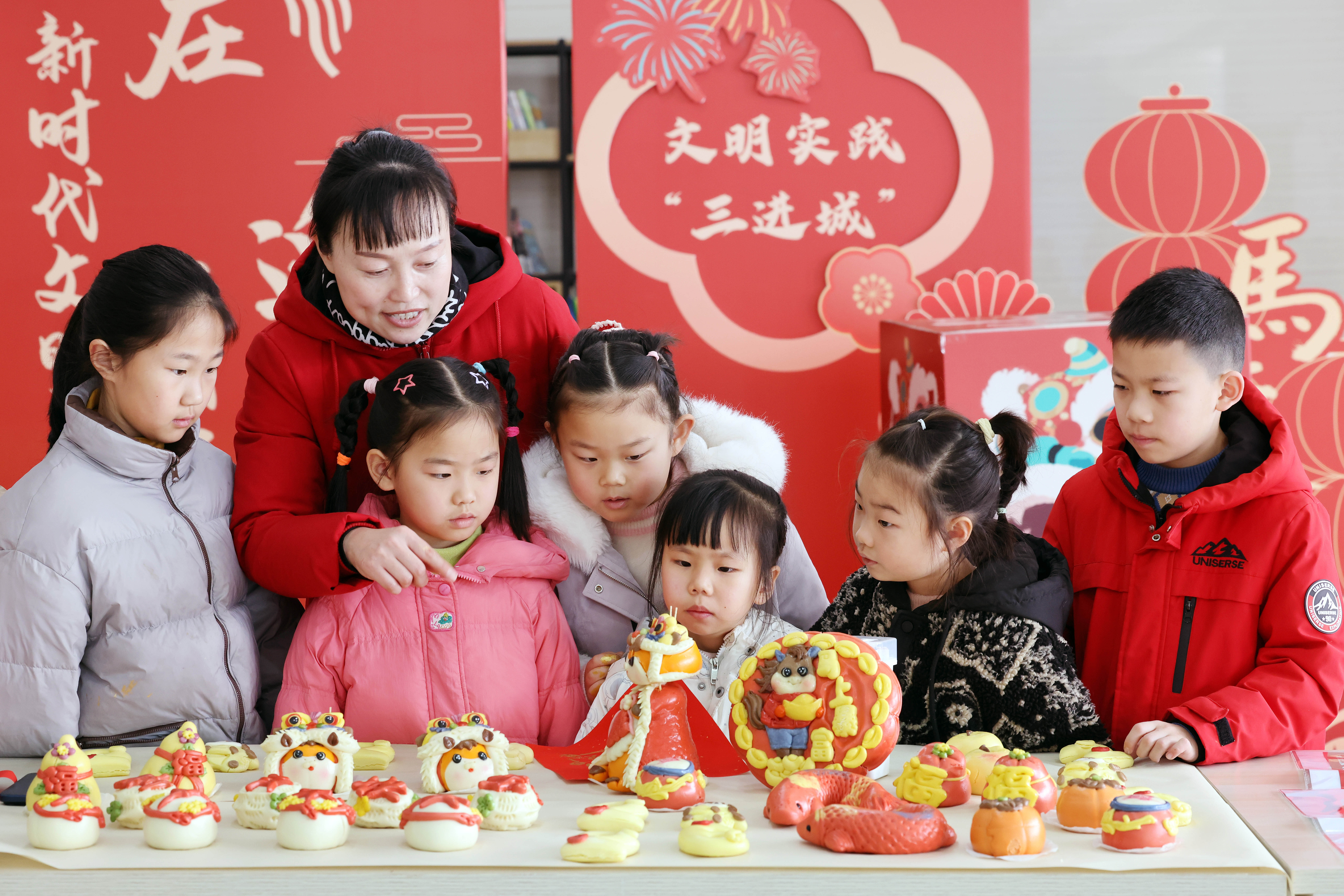 在传统文化体验区,剪纸手艺人杨春英老师手法娴熟,一张普通的红纸经过折叠、剪刻,顷刻间变成栩栩如生的马年窗花,引来阵阵赞叹。“马到成功”“龙马精神”等传统吉祥图案,既传承了千年技艺,又寄托着人们对新年的美好期许。一旁的桌上则摆满了各式各样的传统花馍,活灵活现的锦鲤、憨态可掬的福马、饱满圆润的寿桃。“花馍是我们老一辈传下来的手艺,每一样造型都有吉祥寓意。”工作人员详细地向围观居民讲解花馍的制作方法、流程以及花馍的发展历史,家长孩子们听得津津有味。