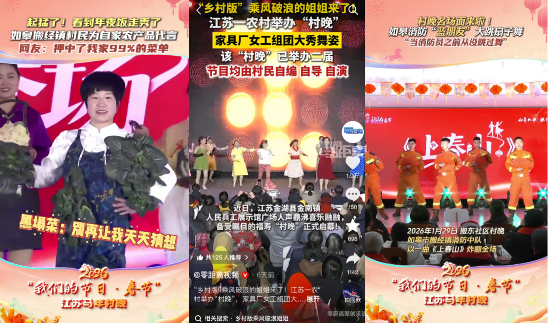 这里没有明星爱豆,只有叔叔阿姨、隔壁大哥、村口小妹当主角。如皋搬经镇村民直接把农产品穿上身,为自家代言,大葱、花生、黑塌菜摇身变成潮酷高定,年夜饭走秀惹得弹幕刷屏。在淮安金湖福寿村,家具厂女工组团大秀舞姿,一曲舞跳上热搜,“乡村版”乘风破浪的姐姐原地成团,slay全场!单条短视频播放量飙破400万,网友转发、点赞、集体催更:建议原地成团,巡演安排上!