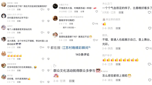 “不愧是苏大强,村晚跟苏超一样卷!”“普通人也能展示自己,登上舞台,大放光彩!”“建议全国巡演!”“群众文化活动就得群众多参与,大家一起热闹!”……