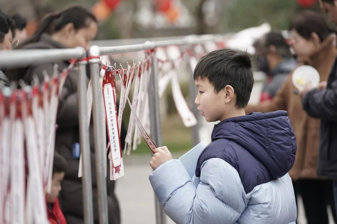在舞台周边,河下古镇文思谜社精心创作的300条原创灯谜整齐悬挂在红绳之上。这些谜题大多与时代发展、淮安发展有关。不少市民驻足品读、结伴解谜。“这个灯谜我知道答案!”市民徐晨爱成功猜出谜底后,开心领取奖品,脸上洋溢着藏不住的喜悦之情。