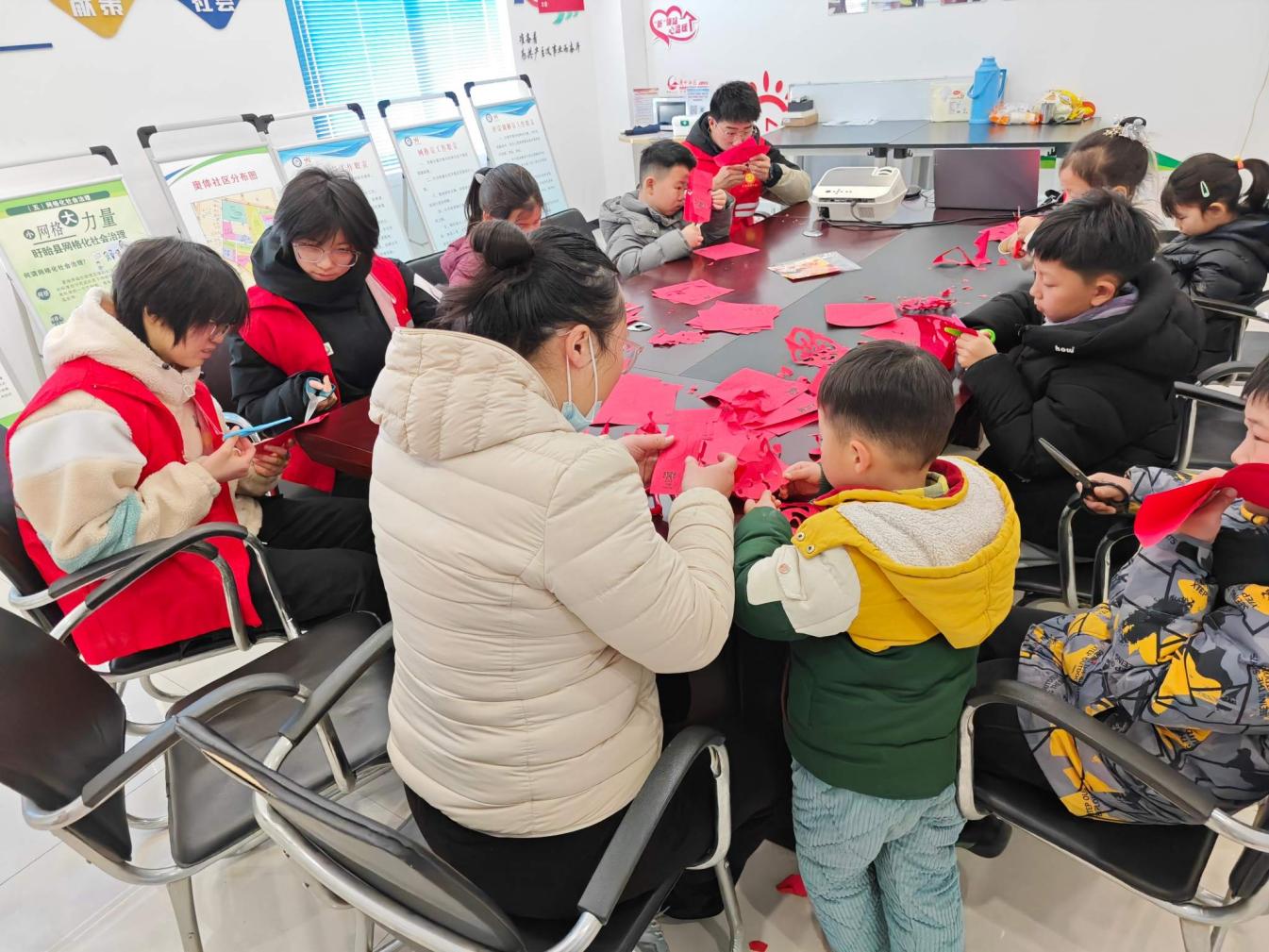 在剪纸现场,志愿者向孩子们详细介绍剪纸这一非遗的悠久历史,讲解春节贴窗花的民俗寓意,让孩子们在动手前先读懂传统纹样里的文化内涵。随后,志愿者手把手示范教学,从折纸、画样到下剪、修边,耐心讲解每一个步骤的技巧,并叮嘱孩子们使用剪刀时的安全注意事项,指导孩子们勾勒线条、裁剪轮廓,及时纠正大家操作中的小问题。孩子们相互交流、相互帮助,遇到难题主动向志愿者和小伙伴请教,活动结束后,孩子们高高举起亲手制作的剪纸作品,圆形的卡纸上剪着“福”字、双鱼戏莲等喜庆纹样,还有的作品缀着红色流苏,一张张稚嫩的脸庞和红彤彤的剪纸相映成趣,在冬日里勾勒出浓浓年味与传统民俗传承的温馨画面。