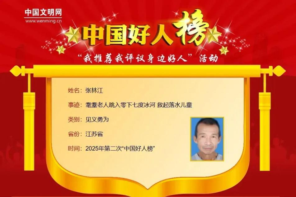 近日,2025年第二次“中国好人榜”发布仪式暨全国道德模范与身边好人现场交流活动在黑龙江省伊春市举办。经各地推荐、网友评议和专家评审等环节,共有150人(组)助人为乐、见义勇为、诚实守信、敬业奉献、孝老爱亲身边好人光荣上榜。来自南通市海门区四甲镇金跃村的张林江榜上有名。