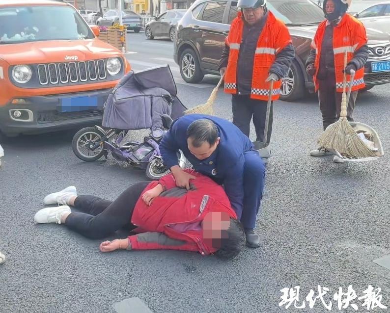 时间回到12月5日下午,泰州市姜堰区人民路与荷花路交叉口发生一起交通事故。一辆橙色SUV在通过斑马线时,与一电动车发生碰撞,骑车老人当场被撞出数米,倒在地上无法动弹。