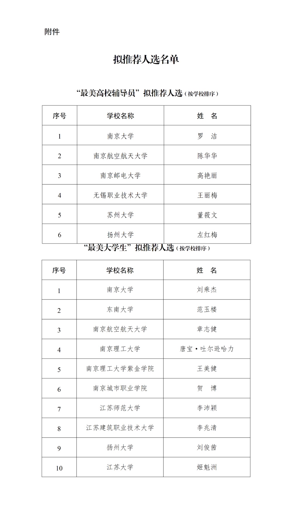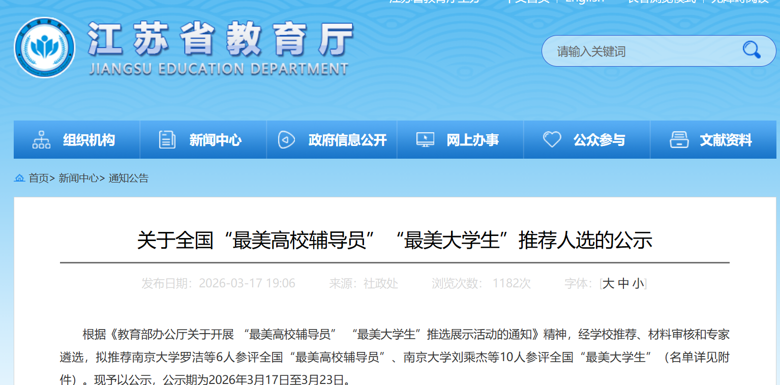 日前,江苏省教育厅公示全国“最美高校辅导员”“最美大学生”推荐人选。根据《教育部办公厅关于开展“最美高校辅导员”“最美大学生”推选展示活动的通知》精神,经学校推荐、材料审核和专家遴选,拟推荐南京大学罗洁等6人参评全国“最美高校辅导员”、南京大学刘乘杰等10人参评全国“最美大学生”。公示期为2026年3月17日至3月23日。