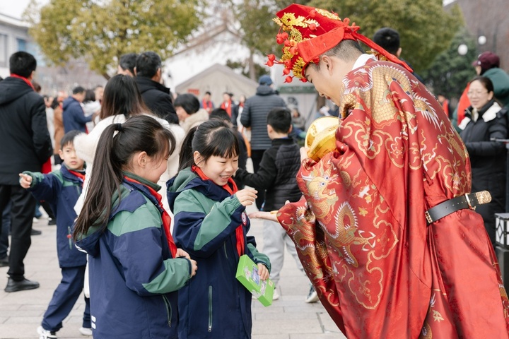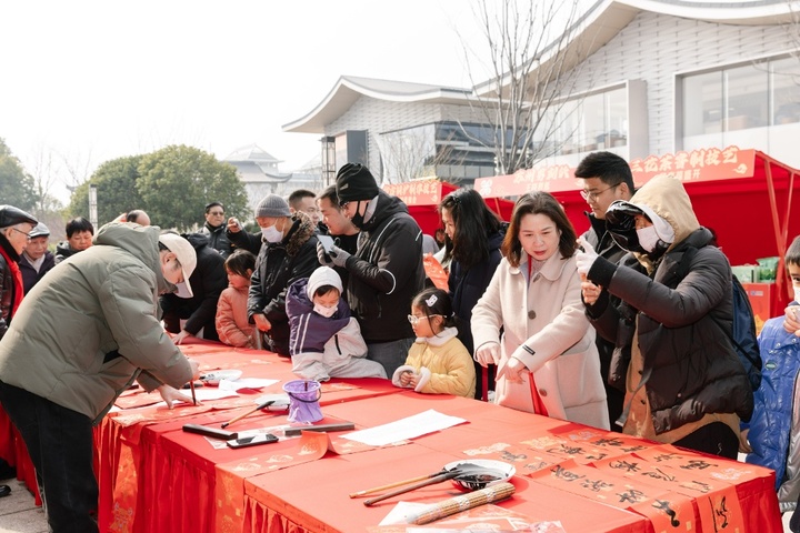 厚重沧桑的古城门是承载城市人文精神的地标建筑,火红的春联象征着人们对美好生活的向往与祝福。在相门景区城墙遗址广场,书法家现场挥笔,给市民游客送上一副副散发着墨香的春联。“九大城门春联赏析”墙旁,人们轻轻吟诵,感受文化年味。剪纸、泥塑、木版年画拓印、仿古铜炉制作等非遗摊位热闹欢腾、引人驻足。“我与苏州城门同框”拍照装置前人头攒动,身着特色服饰的“财”“禄”NPC,为人群送上好礼好运。城墙之下,人们笑意盈盈,沐浴在姑苏城安宁祥和的新春氛围中。