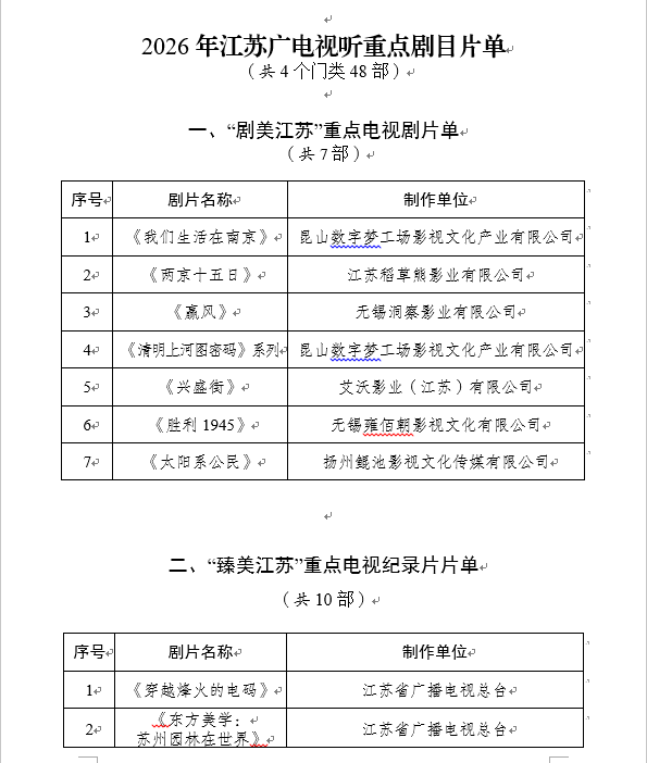 2月11日,全省广播电视和网络视听工作会议在南京召开,回眸总结过去一年全省广电视听发展取得的新进展新成效,并发布2026年重点剧目片单。“十四五”收官之年,哪些光影记忆镌刻“江苏印记”?展望2026,省广电视听内容供给能否“马”上“有戏”?记者从会上带来一份新鲜出炉的“文化礼包”。