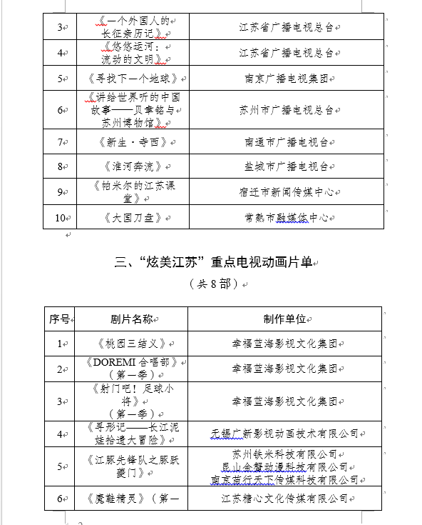 “剧美江苏”电视剧、“臻美江苏”纪录片、“炫美江苏”动画、“创美江苏”网络视听高质量发展行动计划“多点开花”。去年,《北上》《棋士》等6部电视剧(网络剧)收获不俗口碑,《中医世界漫游记》《一群小好汉》等4部动画片、《正义的审判》《遇见最美宋词》等15部纪录片登陆央视,“江苏标识”闪耀全国荧屏。
