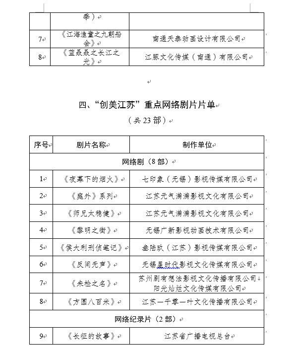 片单涵盖“剧美江苏”重点电视剧(7部)、“臻美江苏”重点电视纪录片(10部)、“炫美江苏”重点电视动画(8部)、“创美江苏”重点网络剧片(23部),共4个门类48部作品。