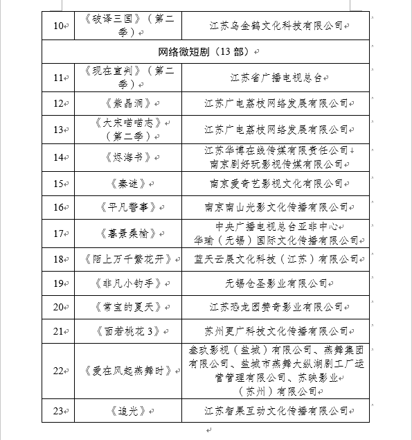 其中电视剧片单中,《我们生活在南京》改编自全国“五个一工程”奖、科幻“银河奖”获奖作品,《两京十五日》改编自马伯庸历史小说,均为近年来备受关注的热门IP。纪录片片单涉及长征、运河、苏州园林、苏州博物馆、淮河等多重元素,电视动画片单覆盖历史、足球、音乐、长江大保护等多元题材,网络剧片片单包括网络剧、网络纪录片和网络微短剧,既有胡军主演的悬疑剧《夜幕下的烟火》,也有根据爆款网文《我师兄实在太稳健了》改编的仙侠轻喜剧《师兄太稳健》,戳中了年轻观众的口味。