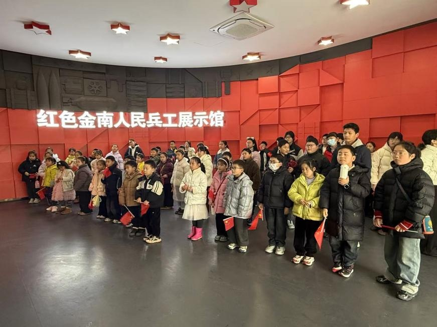 研学活动首站前往红色金南人民兵工展示馆。在讲解员引导下,孩子们驻足复原的茅草厂房前,触摸老式机床,认真聆听“中国保尔”吴运铎的英雄事迹。一件件珍贵实物、一幅幅历史图片,生动展现了兵工先辈的奋斗历程,让孩子们深刻感悟“把一切献给党”的兵工精神,在心中播下爱党爱国的种子。