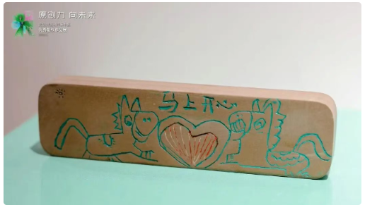 “我爸爸天天捣鼓的就是澄泥石,现在轮到我出马了。爸爸喜欢做石壶和石砚,那我就来做镇纸吧。”这是10岁的张佳瑜对于自己的澄泥石刻作品《马上开心书镇》的创作分享。这块双面雕刻的镇纸,一面刻着“为中华之崛起而读书”,缀以小花笑脸,藏着勤学之志;另一面则是蹦跳的小马环绕红心,“马上开心”四字直白传递童真欢喜。