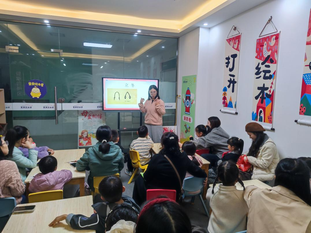 活动在温馨的阅读氛围中拉开帷幕。领读人王老师与孩子们共同分享了儿童绘本《立冬》,用生动有趣的语言为孩子们讲解立冬节气的由来和特点。在分享过程中,王老师一步步演示了“冬”字的演变历程,形象地解说其甲骨文如同一段绳子的两端打上结,表示“终结”,后来被借用来表示一年的终结——冬季。