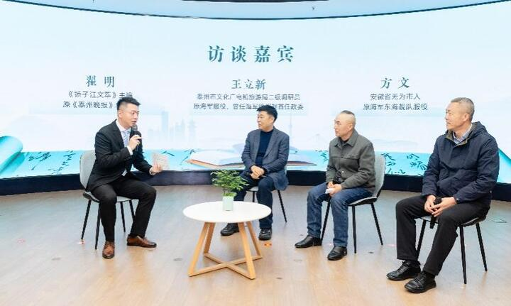 在现场访谈环节,征文活动评审委员会代表、《扬子江文萃》主编翟明;征文活动获奖作者代表、泰州市文广旅局二级调研员、海军徐州舰首任政委王立新;原海军东海舰队战士方文从各自角度,分享了参加征文活动体会。