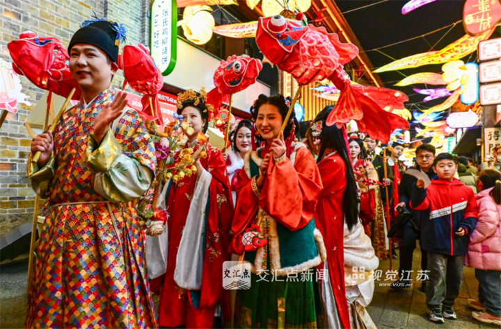 2026年2月28日,徐州彭城七里户部山景区上演了一场传承两汉文化汉服游古城迎元宵活动,前来观看游园演出的市民挤满了整条街巷。郑舟 摄 视觉江苏网供图