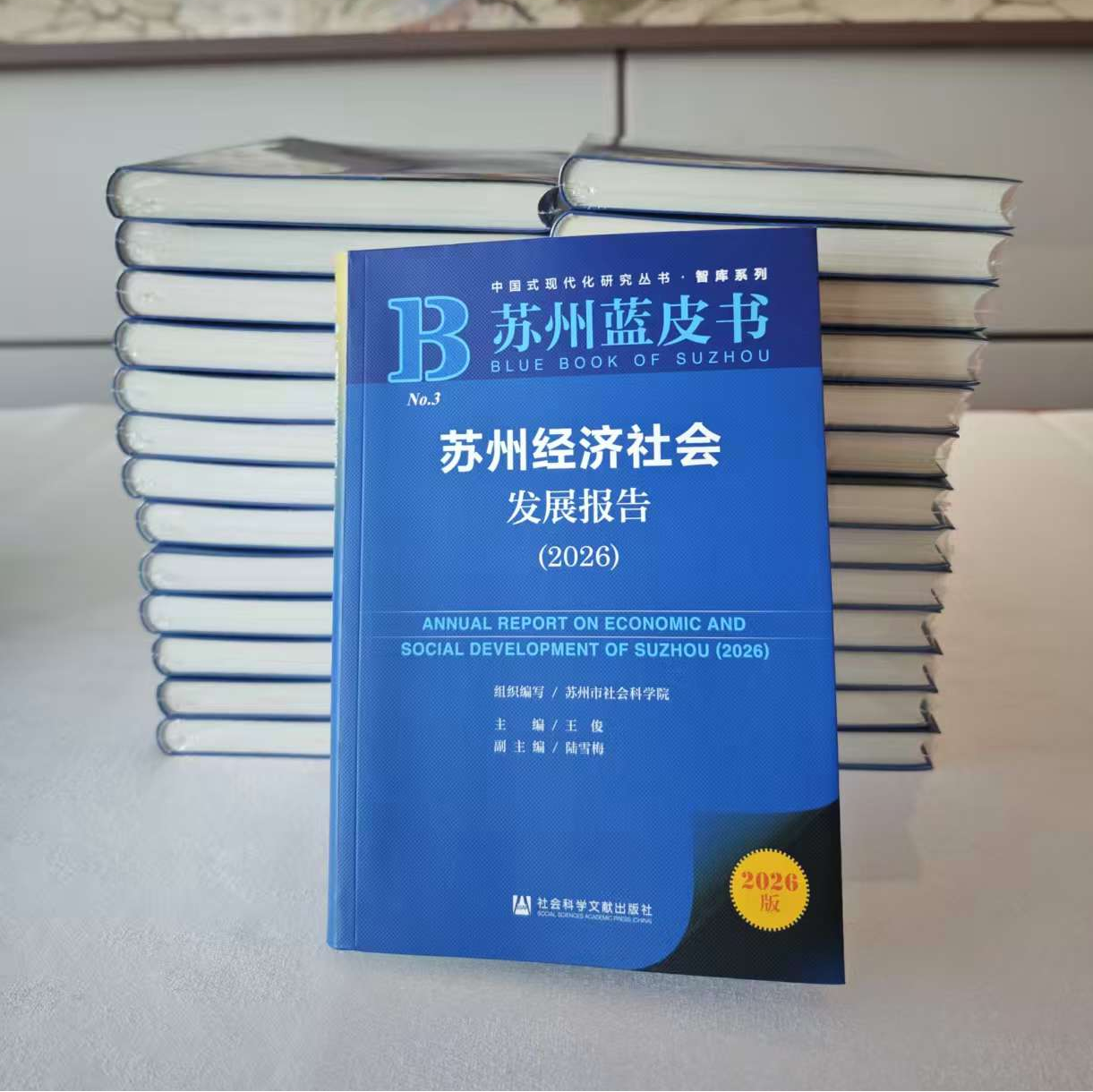 1月21日,由苏州市社会科学院组织编撰的“苏州蓝皮书”——《苏州经济社会发展报告(2026)》亮相市两会会场,吸引众多参会委员驻足翻阅。