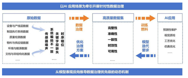 进一步提升人工智能技术在制造业领域的融合应用水平,首先要理清数据治理与人工智能是什么样的关系。人工智能应用的核心是依托高质量数据完成模型训练、推理与迭代,数据治理则是保障数据质量的核心抓手,人工智能应用的深化,反向推动数据治理工作从“被动合规”向“主动价值驱动”升级。