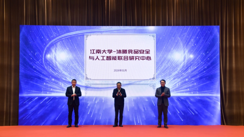 无锡市政府副市长张镇、沐曦股份高级副总裁孙国梁、江南大学校长陈卫共同为“江南大学-沐曦食品安全与人工智能联合研究中心”揭牌